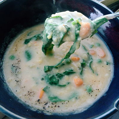 After peas are cooked: Add fresh lemon juice and honey and adjust spices. (Optional: Use blender on 3/4 of mixture to make creamy paste) Add fresh carrots and peas, simmer a few minutes until soften. Ladle into bowls with fresh spinach (cut in ribbons) and 1 tsp. of chopped fresh mint. Stir and enjoy!