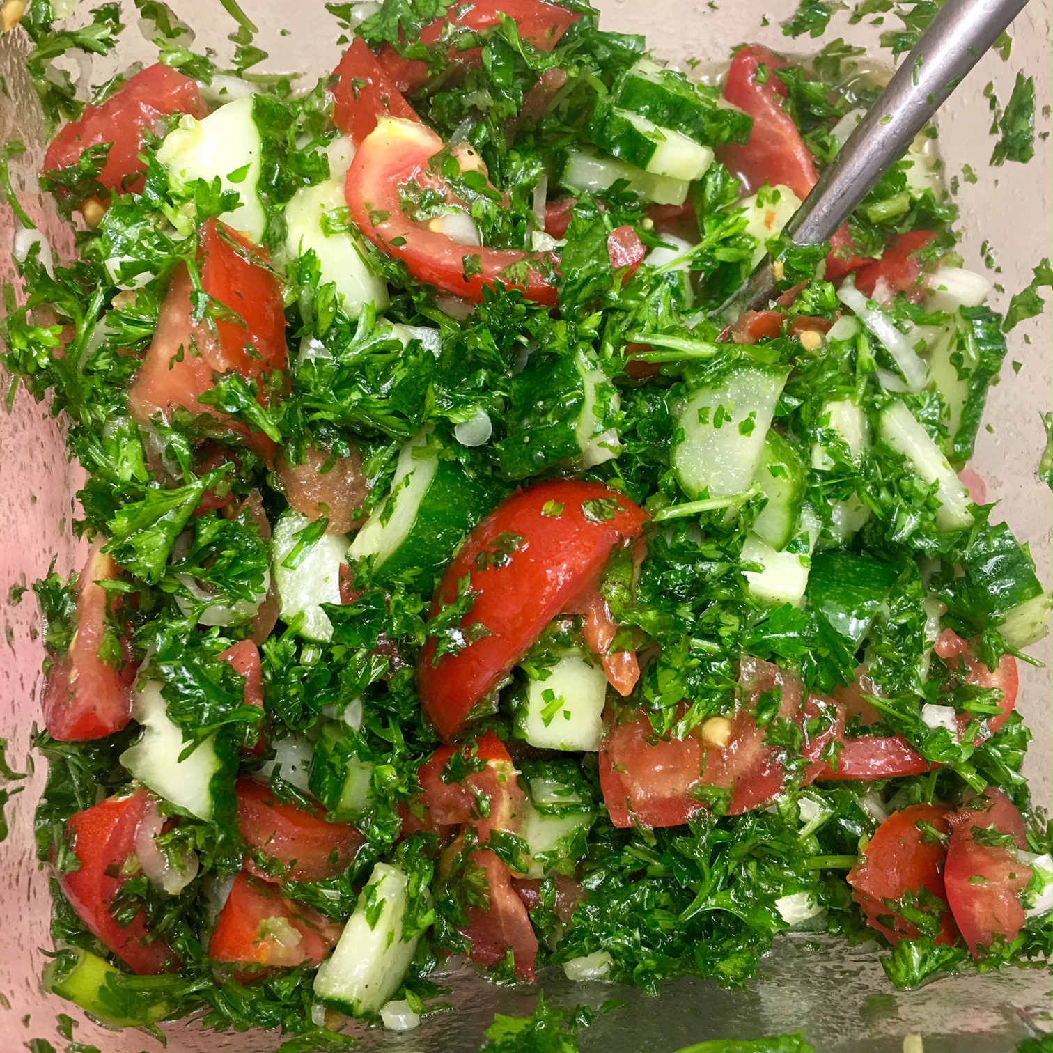 Usually tabbouleh calls for bulgur wheat but I omit it, you could also use quinoa or hemp hearts. Usually I cut the tomato and cucumber into really small pieces but I sometimes leave it in larger chunks. A good trick for the best tasting tabbouleh is cutting the parsley really small. Go on a chopping spree. Here is a more traditional style but using quinoa: