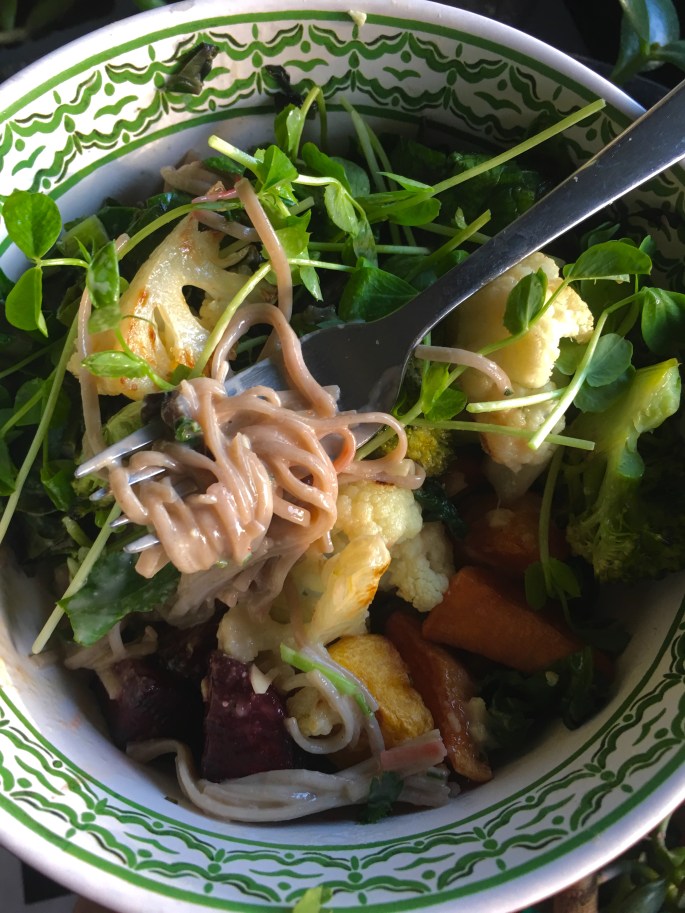 To assemble the final plate I put noodles in, placed greens in half the bowl, roasted veggies in other half, drizzled some more dressing on top, added pea shoots and BOOM! power meal. Leaves you full and feeling great for hours.